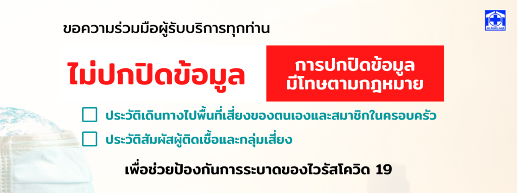 ขอความร่วมมือผู้รับบริการทุกท่าน ให้ข้อมูลจริงและไม่ปกปิดความเสี่ยงแก่เจ้าหน้าที่ เพื่อช่วยป้องกันการระบาดของไวรัสโควิด19 และเพื่อความปลอดภัยของทุกคน